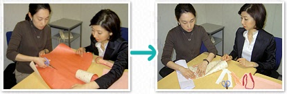 この時、どのように折れば色の配分がよくなるかシミュレーションしながら折っていきます。今回はひだ状に折って、仕上げに更に斜めに折ることによって、内側の色が更に主張するようにしてみました