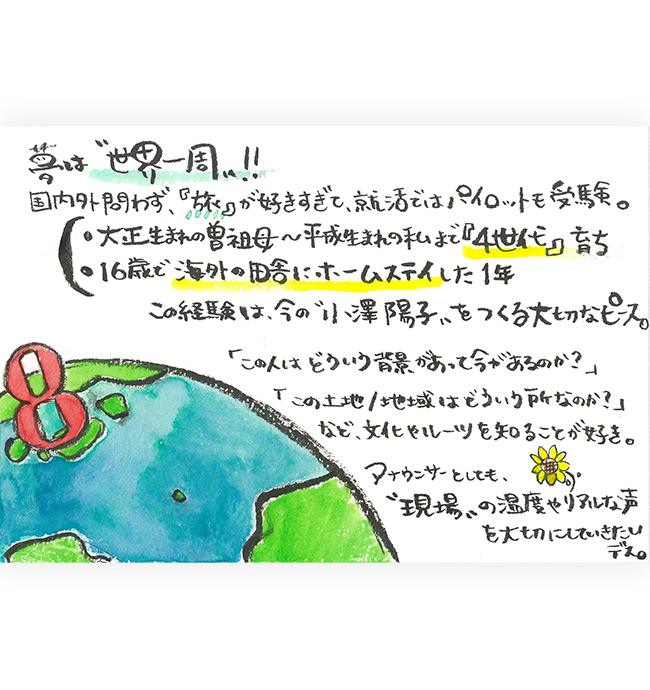 「この人はどういう背景があって今があるのか?」「この地域がどういう所なのか?」など、文化やルーツを知ることが好きで、そんなことを伝えていけたらなぁ~…なんて思っています。現場の温度・声を大切にできるアナウンサーでいたいです。