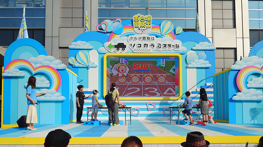 さらに「お台場冒険王2024」で好評を博した参加型ステージゲーム「めざましくんダッシュ」も展示。ダッシュとジャンプボタンを使って来場者4人で勝負してください。