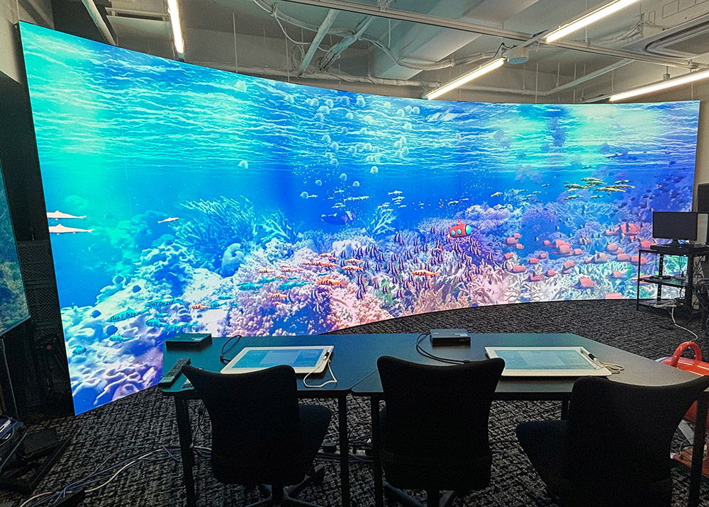 大型ビジョンに映し出される海中のCG映像、その中を泳ぐ魚やカメに色をつけたり、絵を描いたりのアート体験ができます。