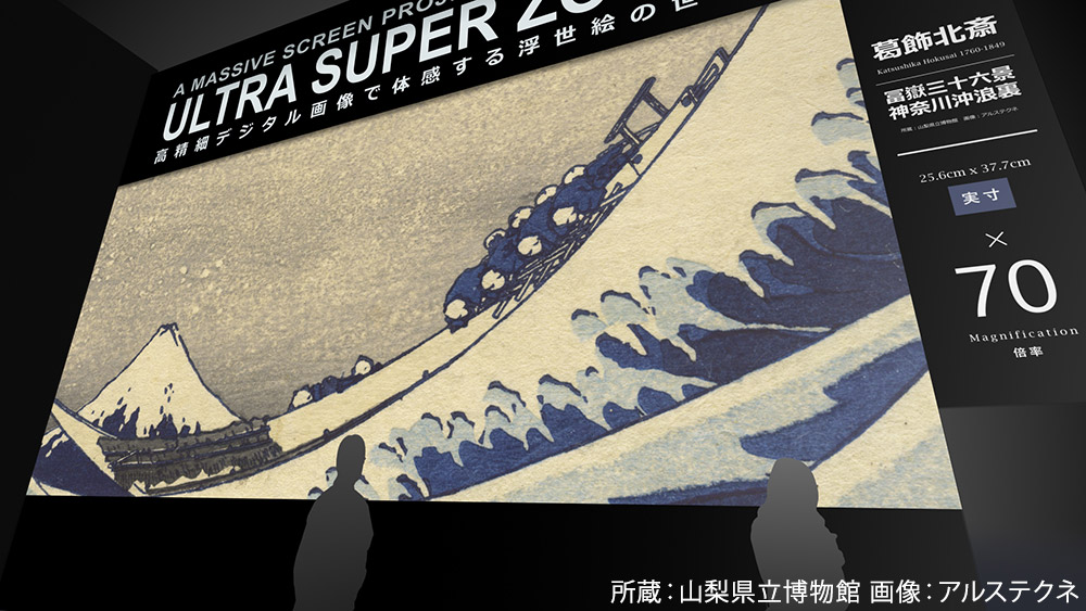 大型プロジェクターで映し出されるのは、高精細デジタル画像で体感する浮世絵の世界「ULTRA SUPER ZOOM」。