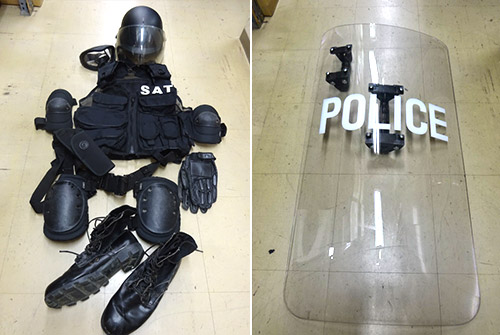 山本左上は機動隊の装備です。右側下は警察官のものですが、実は今から25年前に装備が変わりました。そこで国から出されているもの、例えばベルトの幅は何センチとかピストルケースは何センチであるとか、そういった資料を基にして作成したものです。