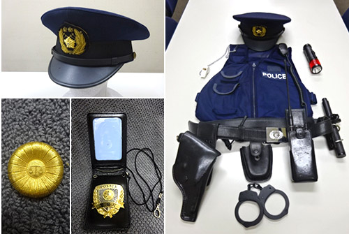 真ん中にある警察手帳、バッジがついていますが、その上の空欄になっているところに顔写真が入ります。これは一般の方が見る限りにおいては“作り物”には見えないと思いますので、警察署には撮影用という届けを出して、警察庁の認可を得ています。作りが多少異なっていればいいということで、例えば「POLICE」の文字が本来は1.5cm幅であるのを1.1cm幅にしているとか、そういうことであれば“良し”とされています。
