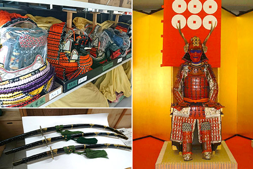 伊藤先ほど言いました高津装飾美術や藤浪小道具では、こういった時代劇で使う刀や甲冑などを扱っています。右は真田幸村公の鎧で、高津さんが大河ドラマ用に作成したものですが、役者さんに感じていただけるように、本物に近い重さでしっかり作ってあります。左上は藤浪さんのものですが、歌舞伎は舞台で動きまわるのでかなり軽量に作られています。刀も照明が暗いので、柄が派手に作ってあります。「装飾」ではこういう甲冑の着付けも行います。