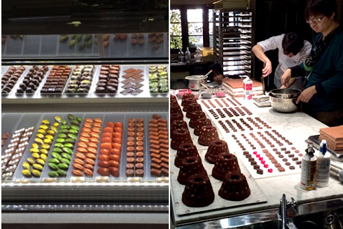 若林右側下は『失恋ショコラティエ』というドラマのチョコレートの店の風景です。普通にショーウィンドーに飾るのは、あらかじめ包装されたものをきれーいに並べておけるのですが、常に温度の低い所でないと溶けますよね。しかしスタジオは照明がガンガンに当たっているので、だいたい溶けますよね。