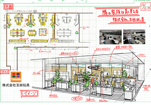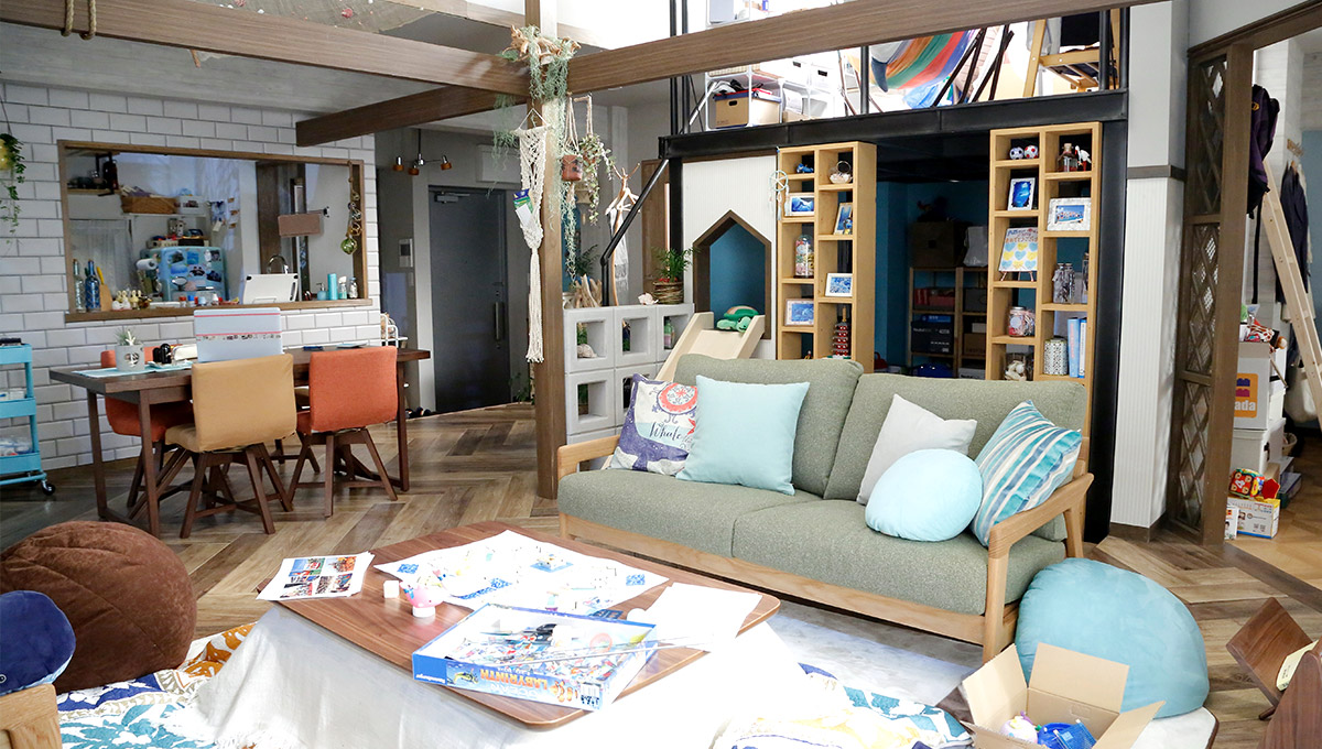 主人公が勤める玩具メーカーのセットは、スタジオを飛び出して通常はスタッフが作業する、オフィススペースに作りました。