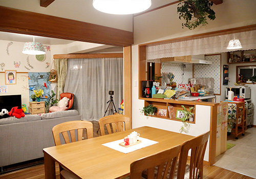 登場人物たちがすれ違う重要なシチュエーションなので、どの家庭の入り口を背景にしても絵作りができるように全方位で撮影できる作りになっています。