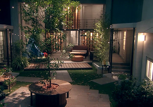 たとえば、4世帯の玄関に通じる中庭パティオ。