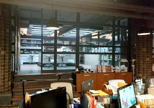 通路を挟んだラボスペースは、対照的なブルー系の照明。