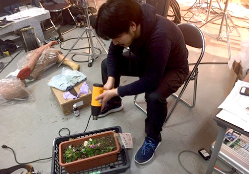 特殊効果スタッフお得意の手作りマシンで、吹き付けます。