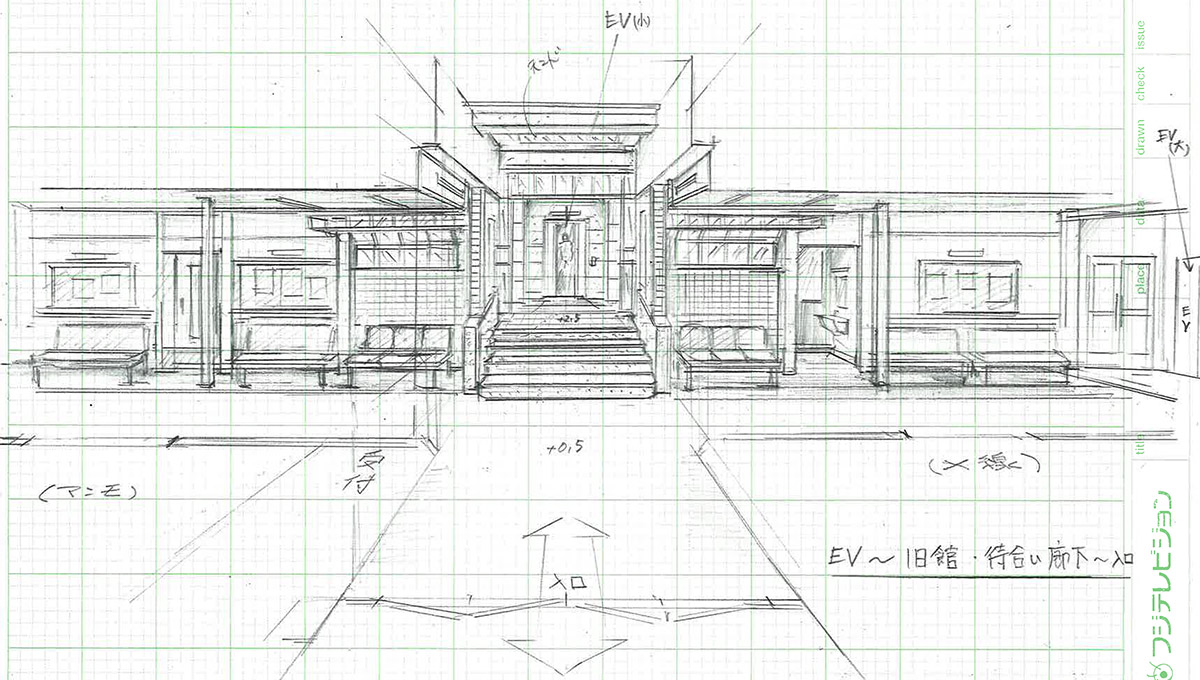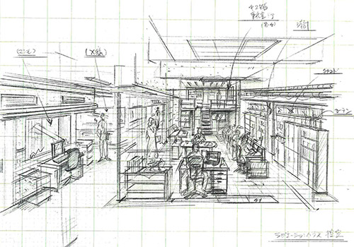 どうしても横長の配置になるなぁ、と思案していた時に、監督と雑談していて、いっそのこと横一列にしてみるか、という話が出て、試しに図面に描き入れてみたら意外と面白いデザインになったんです。