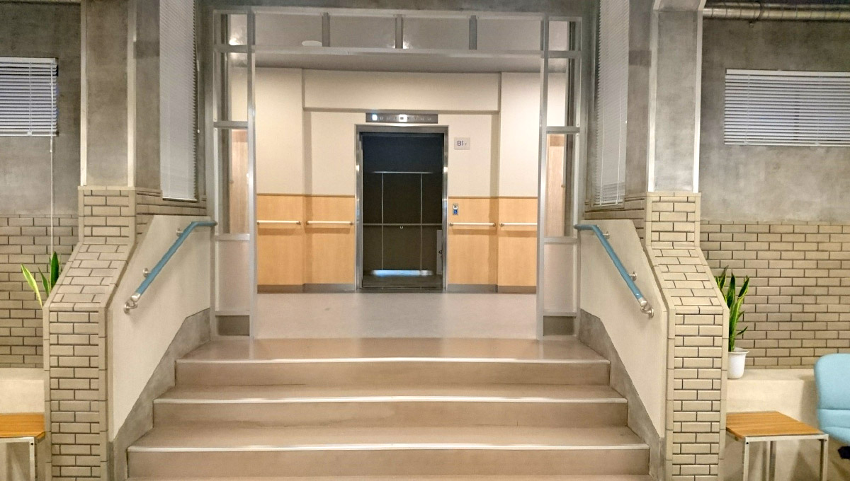 ドクターが降りて来るエレベーターがある廊下までは本館で、壁は白と薄茶色の木目、手すりも白、部屋のドアには絵も掛けてあって、清潔感と上品さを出しています。そしてエレベーター前の階段を下りて技師達のエリアに入った途端、壁は雑なコンクリート仕上げと昔のタイル、手すりも灰色がかった水色、とレトロ感を漂わせています。