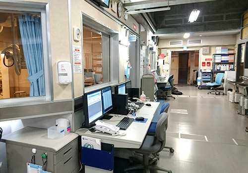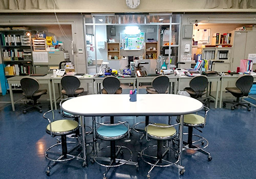 実際の病院では、技師達のデスクは普通のオフィス同様、向き合った配置です。
