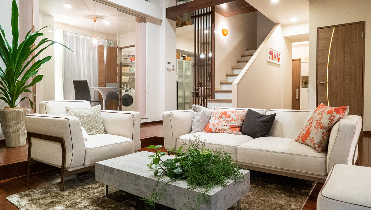 「高層マンションの一室で、メゾネットのおしゃれな部屋」という設定です。マコチは小説家の家に居候していますが、カップルの同棲とは違うので、ドライな印象になるよう、共有スペースには温かみを出さない、どちらの個性も出さないことを心掛けました。たとえば、普通は手すりに手垢を付ける“汚し”をかけますが、一切しない。お揃いの物はなし。ソファにもカバーを掛けず、新品をそのまま置いてあるだけ。リビングのテーブルにもテレビのリモコンしか置いていない。殺風景な部屋です。