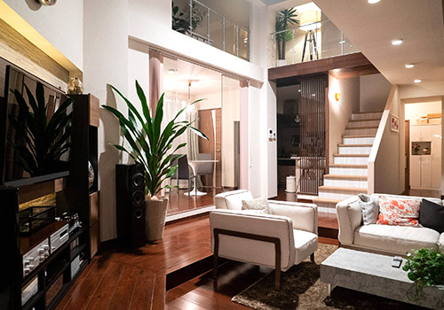 あとは、高級マンションという設定上、広く見せる必要があるので、カメラの撮り口から見て斜めのアングルに部屋を配置して奥行きを出しています。それと、メゾネットの2階を強調するためにフロアの区切り部分に外側から横木を渡して、高さも見せています。メインセットでもないのに、スタジオではこれが一番幅をとってますね(笑)。