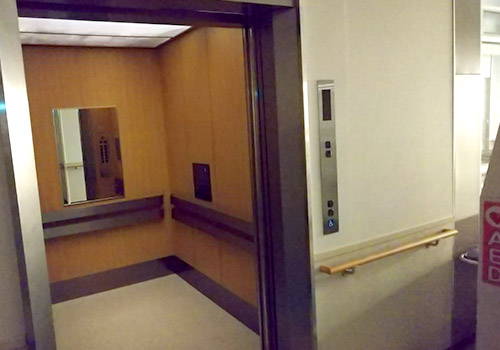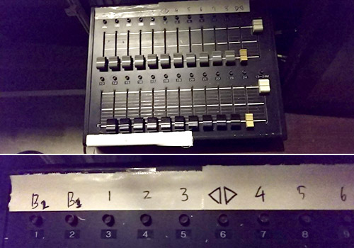 自動で開くかのごときエレベーターも、扉の開閉は裏方がロープで操作。回数表示のライトも電飾スタッフが芝居に合わせて点灯させます。
