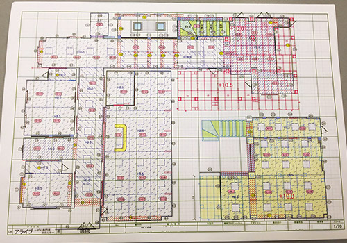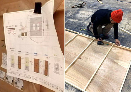 通常、工場で作ったセットパーツをスタジオで組み立てるので、資材の厚みや材質による伸縮も計算に入れ、