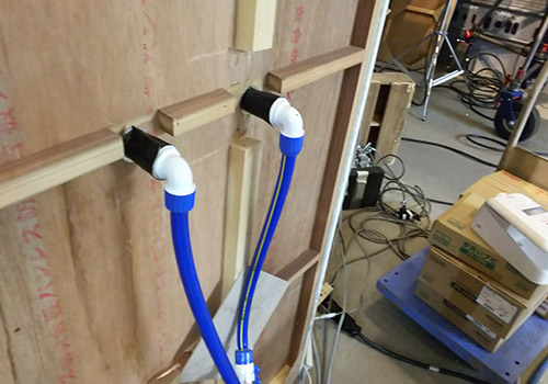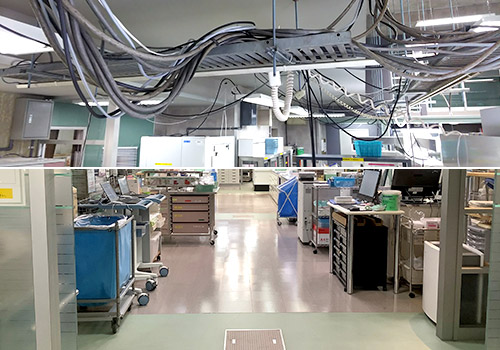 実際の薬剤部では、このカートが行き交う床にはコードが這っていません。ほとんどのコード類は天井から。その雑然としたリアリティーを表現しました