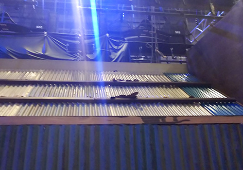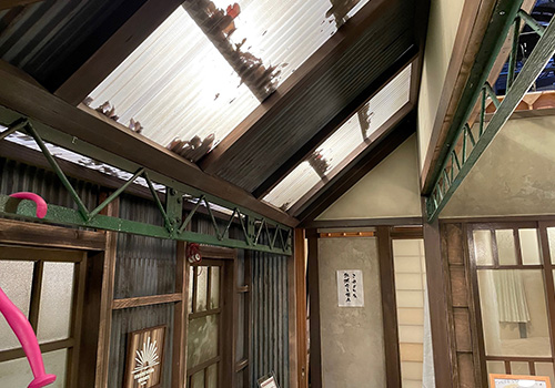 波板に溜まった枯れ葉。これも装飾スタッフの仕掛けです。