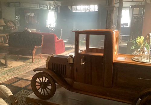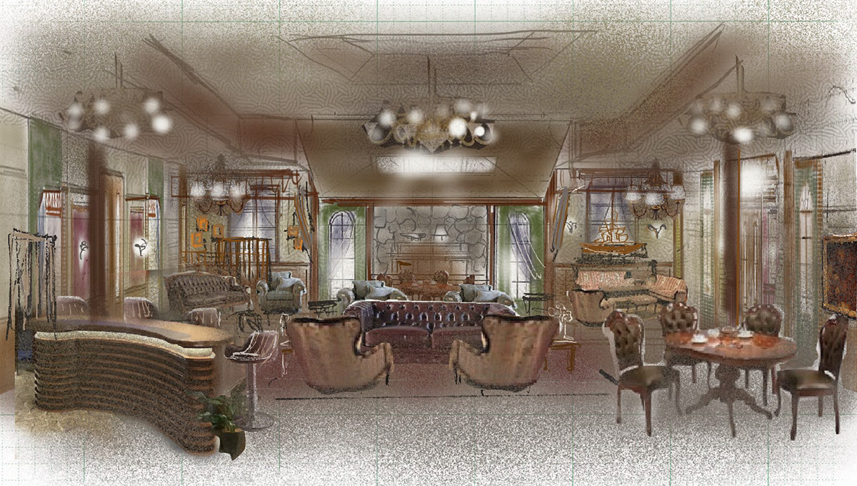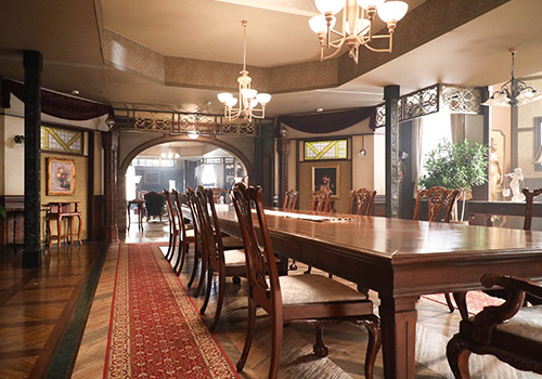 ― 「クラシックミステリー」ということなので、西洋風の重厚感を意識しました。といっても、普通にデザインしてしまうと「ホテルのロビー」になってしまう。あくまで個人の別荘ですから「趣味性」や「クセ」が感じられる空間にしています。“一品モノも多いのにどこか統一性もある”というニュアンスを出すため、装飾スタッフとはかなり細かく打ち合わせをしました。