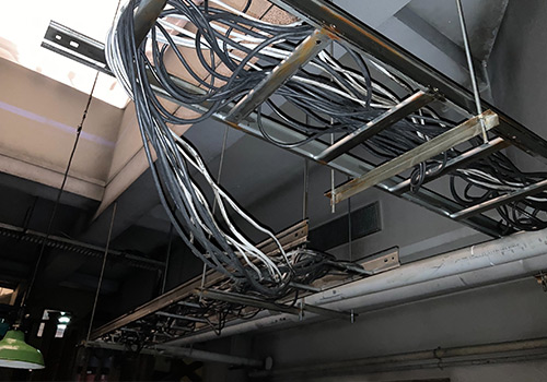 見上げれば、むきだしの配線がオブジェのようにぶらさがっています。火事にならないか心配ですが、ここはスタジオ。