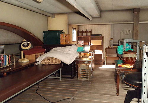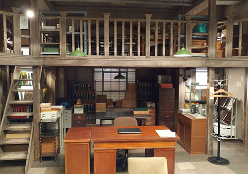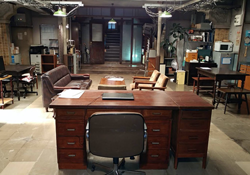 ボロボロの事務所で「もらっても、ほどほどに要らない物件」というイメージです。この“ほどほどに”のニュアンスで苦労しました。“昭和感”満載のボロい物件というよりは、少し外国映画っぽいクラシックなところもある落ち着いた空間を目指したのですが、バランスが難しい。一度本当にボロボロのソファを置いてみたのですが、監督から「やり過ぎ」と言われてやり直したこともありました。構造的には正面奥がロフトになっているのが特徴で、手前と奥の芝居ができるようにしています。