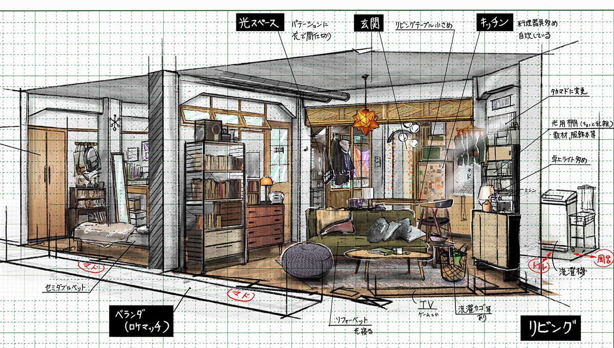 美術デザイナーとして今回は、主人公3人の生い立ちからイメージを広げて、それぞれの部屋に反映させたつもりです。美術セットや小道具も含めて、違う個性を持つ3人の物語を楽しんでもらえたらうれしいです。