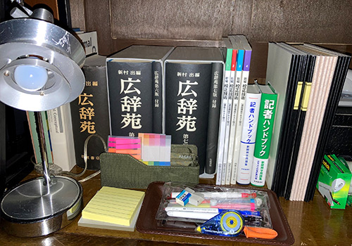 「広辞苑」が3冊。最新版以外に改訂前のものも揃えているようです。「記者ハンドブック」や各種辞典など、文字と向き合う日々を想像させる書籍を装飾スタッフが集めました。