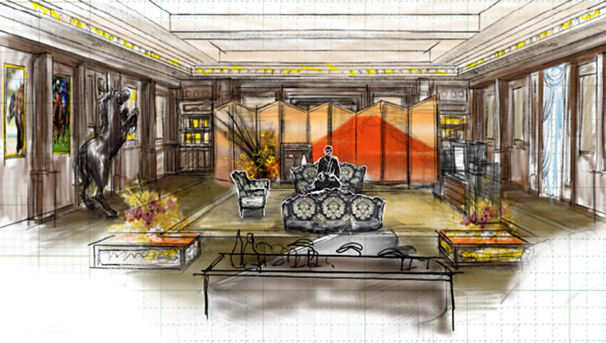 都知事の自宅リビングに置いた赤富士の屏風も大変でした。専門の絵師スタッフに描いてもらったのですが、何せ“国宝級の屏風”という設定なので、わかりやすい美しさの絵とは違う趣がないといけない。苦労して描いてもらった絵を、申し訳ないと思いながら何度も描き直してもらいました。