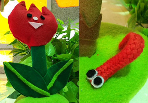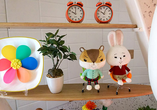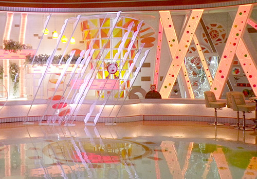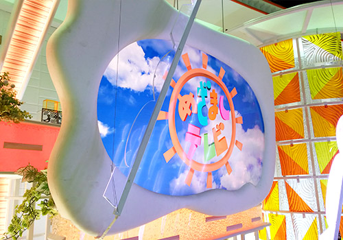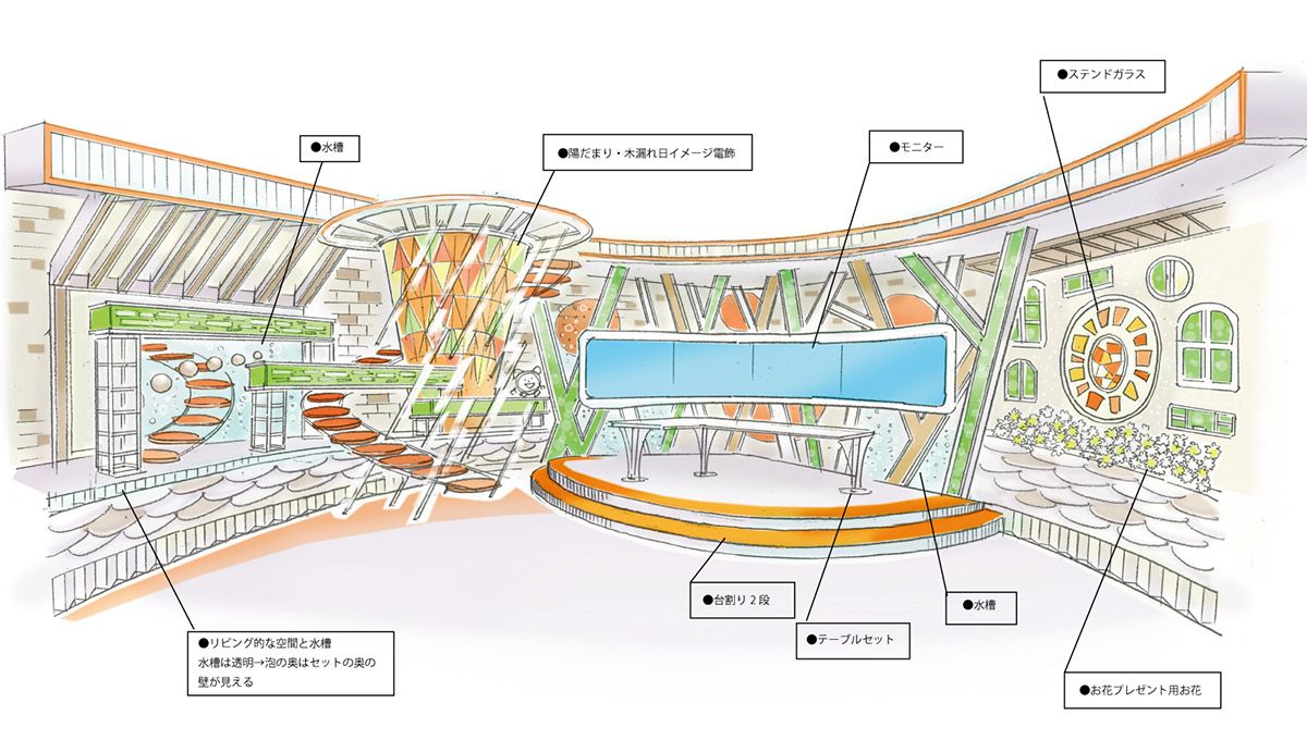 司会の背景には、楽しそうなオブジェがいっぱい並んでいます。