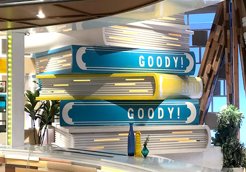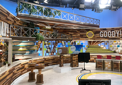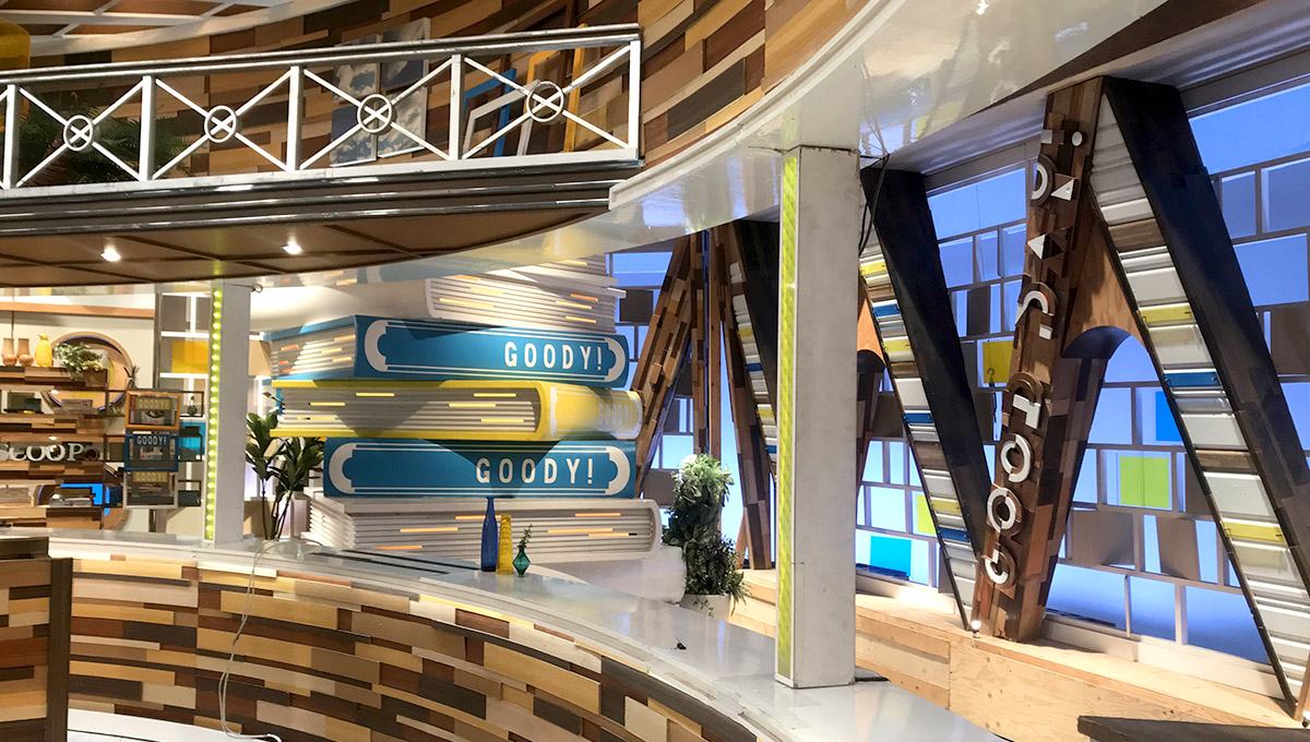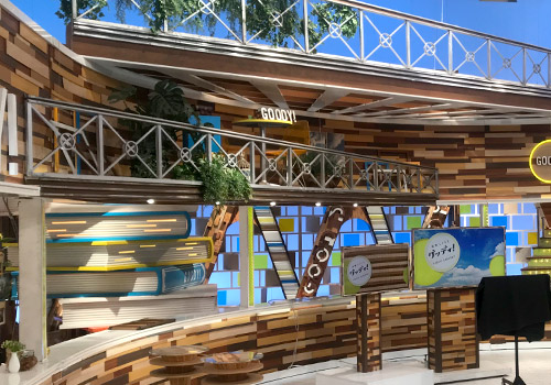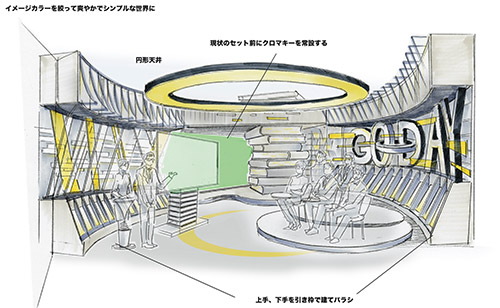 回を重ねるにつれて番組コンセプトが明確になってきて、もう少し落ち着いた、かつさわやかな雰囲気の中で情報を伝えていくのがいいのかな、という話になりました。そこで、晴れの日の空と光の色、青と黄色をスタジオと番組ロゴのベースカラーにして、ピンクや緑色はセットから外しました。色を取った所は木目に変え、空・太陽・木に囲まれた午後のひととき――という具体的なイメージのセットに様変わりしたのが今のものです。
