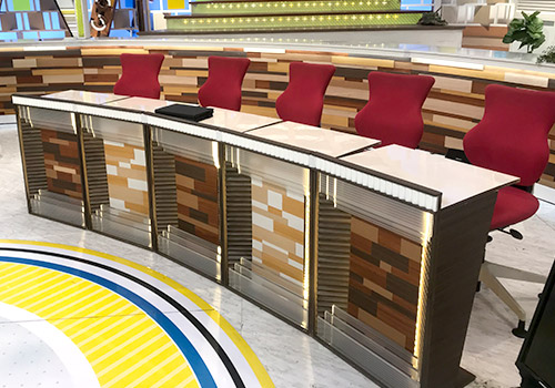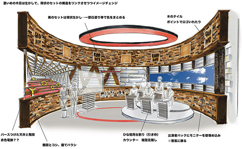 現在のセットの形に至るまでには紆余曲折しました。はじめは番組構成の詳細が固まっていなくて、プロデューサーからはただ一言、「積み木をモチーフにしようかなぁ……」と言われただけでした。積み木から「子ども部屋」を連想し、安藤さん・克実さんがいる場所となれば「大人の遊び部屋」をコンセプトにしてみようかと。色的にも遊びをたくさん取り入れ、カラフルなセットにしたのが最初でした。