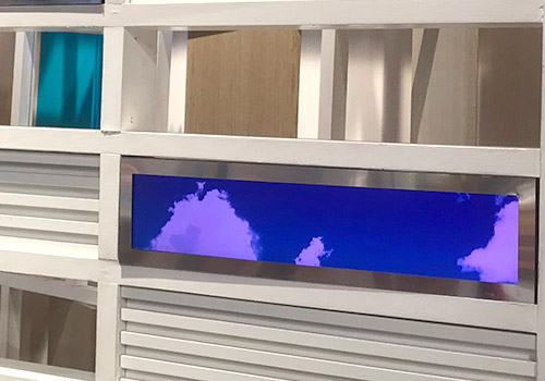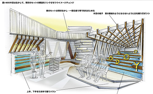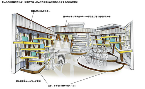 1つ挙げれば、スタジオの中に「陽だまり」を作りました。外壁のアクリルの角度を微妙に調節した所に照明を当てているのですが、温かい光の感じを出すのには電飾も手伝っています。こうした贅沢なコラボレーションで遊べるのもセットデザイナーの醍醐味ですね(笑)。