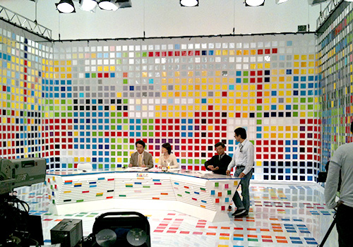 私のデザインで今のセットは3代目になりますが、3代通してのモチーフは「カラーバー(=テレビ局が放送休止時に試験電波として流す信号。映像調整の基準となるもの)」。カラーバー、つまり“テレビ放送の原点”に立ち返って自己反省をしよう、という番組コンセプトから発想したものです。