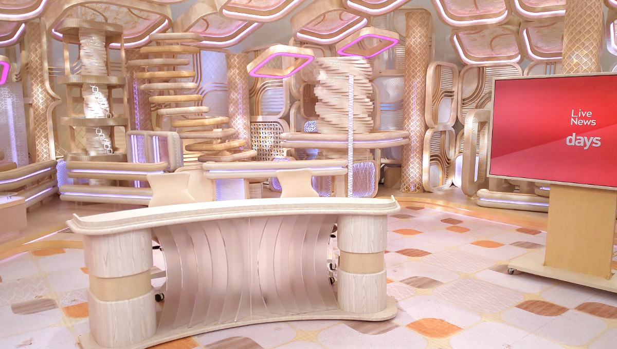 色味は床も含めて全体的に、抑えめのナチュラル色にしています。番組タイトルロゴは昼の『days』がピンク、夕方『it!』は黄色、夜の『α』で紫を使っていますが、セット内の大型LEDビジョンに映すロゴが映えるよう、あえて薄いベージュやアイボリーなどの控えたトーンの色でまとめました。