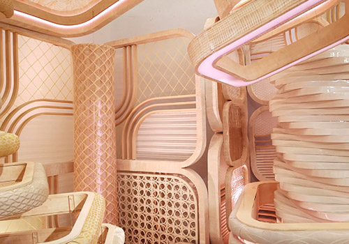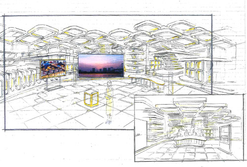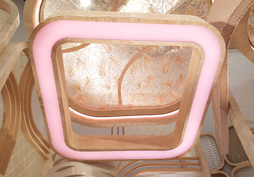 「柔らかい」、けれどもニュースに求められる「鋭さ」も併せ持つ何かをモチーフにしてみようかと考えました。その結果ベースに設定したものが「スクエアリング」です。形に主張はあるが角がない。シャープでソフト。この「スクエアリング」のいろいろな大きさ・素材のピースを組み合わせて、さまざまな空間表現をしてみました。