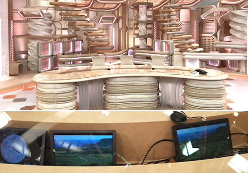 スタジオを最大限に広く使えるよう、ニュース番組にとって重要なアイテムである大きなLEDビジョンをレールで動かせるようにしました。幅5mのビジョンを約10m動かせるようにして、3番組で共有しつつもそれぞれが独自の使い方で活用できるようにしています。