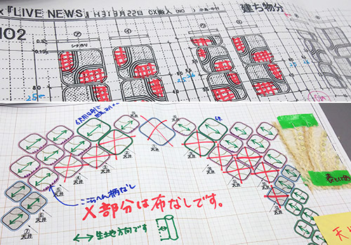 これは、「建ち物」と呼ばれる背景壁の発注図面。