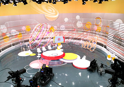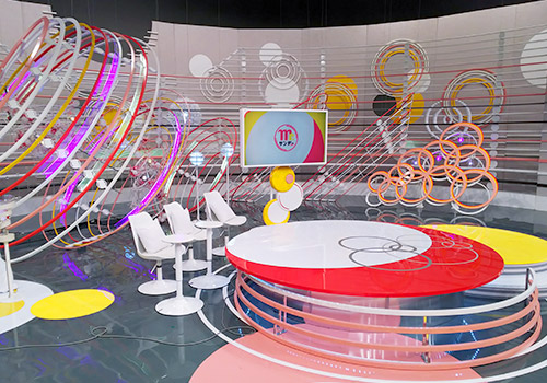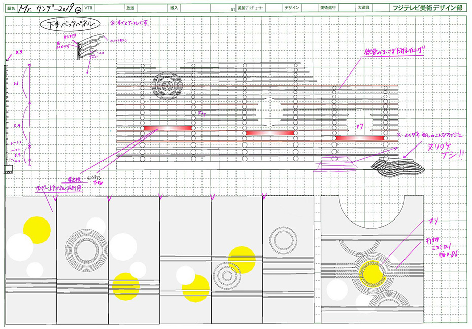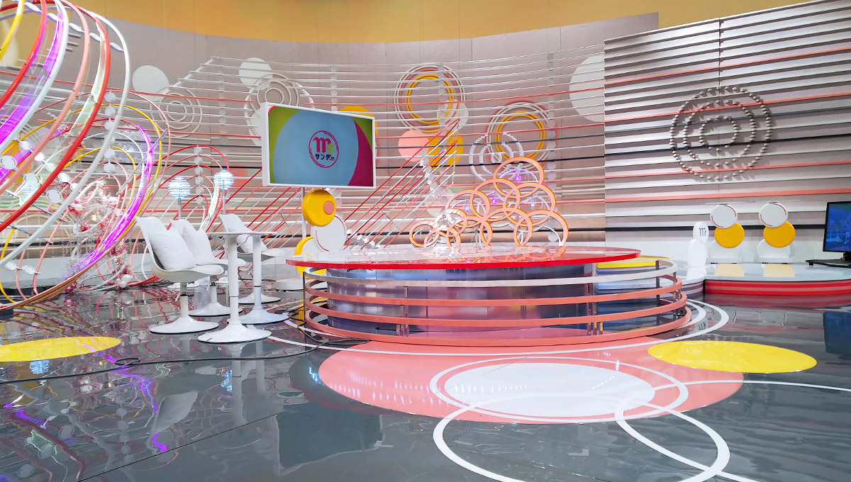 新しいセットはその“波紋”を象徴した「円」をちりばめたデザインにしました。一番大きいオブジェはもちろん、MCが立つ台も円形。“波紋”はセットだけでなく番組の統一コンセプトとして、名前のテロップを乗せる座布団(=ベース)やワイプ(=画面の片隅で出演者の表情を映す小さな窓)の枠も、四角形の角を取った形にしています。モニターだけはさすがに角を削るわけにもいかないので四角のままですが(笑)。
