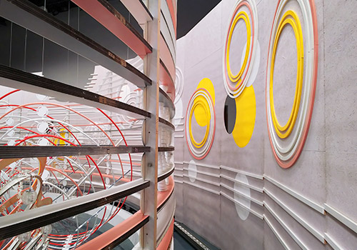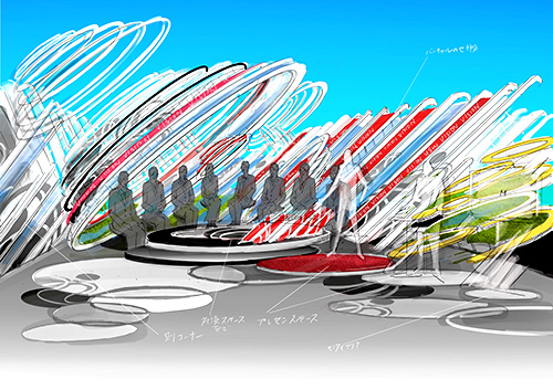 「全部のパーツが円のセット」って、自分でイメージ図を描いてみたのはいいけど、どうやって建てよう、と……。アートフレームのスタッフに発注、というよりほとんど悩み相談でした(笑)。鉄骨や木(モク)のいくつもの輪を組み合わせる際、それらを支えるのにどうしても1本のまっすぐな芯が要るんです。“波紋”が広がっている世界の中にその棒が入ってしまうのが嫌で、その支え棒の表にも小さな円をたくさん貼り付けて、棒を見えなくしています。円だらけのセットが建った後、あるスタッフには「本当に建ったんですね。こんな形のセットは無理かと思ってました」と言われました(笑)。