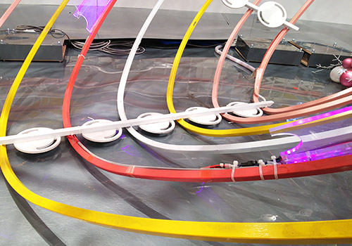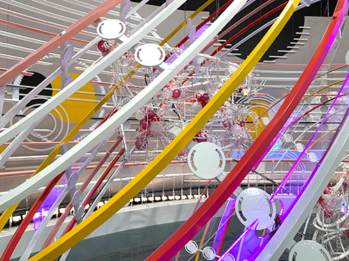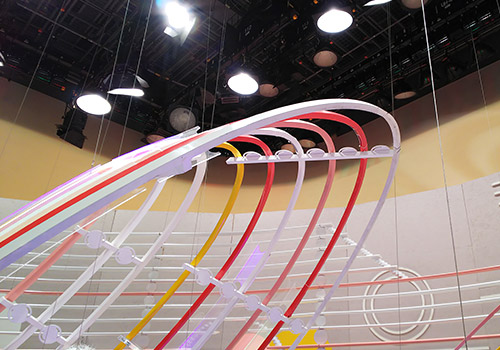 リング状の電飾ですね。導光板を使っているのですが、普通、導光板は板状のまま光らせたい素材にくっつけるところを、今回は輪の形に曲げたものを鉄骨に付けて光らせています。電飾スタッフとしても初の試みだったようです。