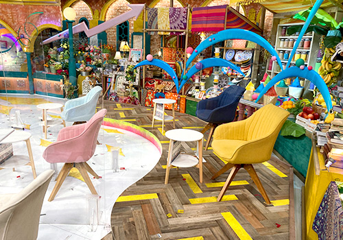 様々な情報を扱う番組の特色を、いろんな物が行き交う“青空マーケット”で表現しています。そこはカルチャーが交差する場所で、とにかく活気があって何もかもが動き出しそうな世界をイメージしています。不思議なスパイスも加えたいので、アラジンの世界というかちょっと魔法めいたニュアンスも意識しています。たとえば下手にあるポップコーンの入った容器の中や、壁に浮かぶ雲状のオブジェの裏などにテープLEDが仕込んであるのですが、その色味もエキゾチックにしています。LEDの特徴として色はもちろん調光も自由自在なので、明るさを変化させたり色を回したりといった電飾の技を使って、動き出しそうな雰囲気を狙いました。