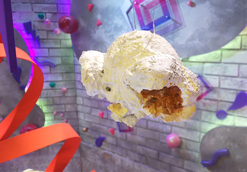 あのポップコーンは、大道具スタッフが一つ一つスチロールを削り出して作った労作なんです。たとえば空中に飛び出したあの大きな一粒については、私からは「七寸角くらいで」と大きさの指示を出しただけ。その後は、大道具スタッフが本物の小さなポップコーンを前に集まり、こっちから見たりあっちから見たりと徹底的に観察してから、カッターなどを使って手作業で削っていったと聞きました。最近はレーザーカッターや3Dプリンターも進化して、プログラミングでできる作業も増えたのですが、手彫りの出来栄えが勝ることもあるんです。