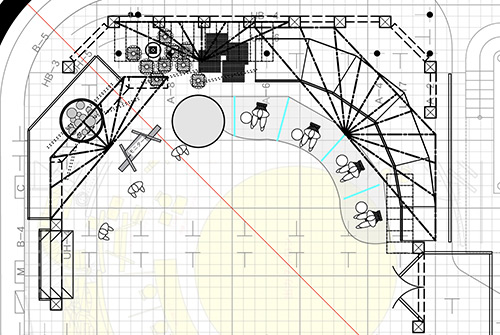 セットのあちこちを「放物線」や「矢印」が横切るデザインに。