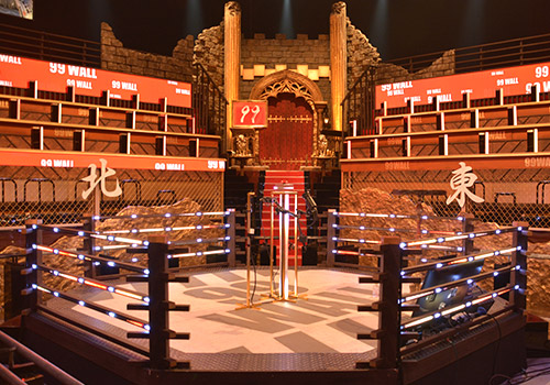 「四面楚歌」。四方を取り囲まれたコロシアム風にしたい、と言われました。それで、格闘技のリングをイメージしたステージを中央に置いて、そこに向かってあたかも高い壁が迫りくるような空間を作りたいと思いました。