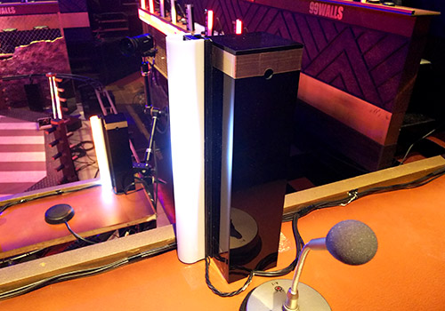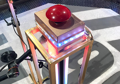 画面には映りませんが、逆に、来てくださった方々にとっては間近で見られる、さわれるセットなので、細かい部分にもこだわりました。レンガ風の壁紙もスタジオセットに合わせて何度も作り直しましたし、解答ボタンも本番と同じものを置いています。出番の前にこのボタンで早押しの練習をしている人もいて、「そういう用途もあったのか」と(笑)。