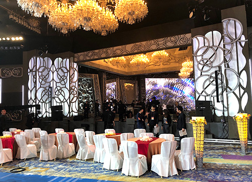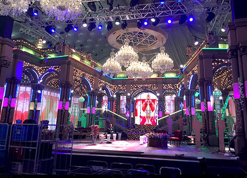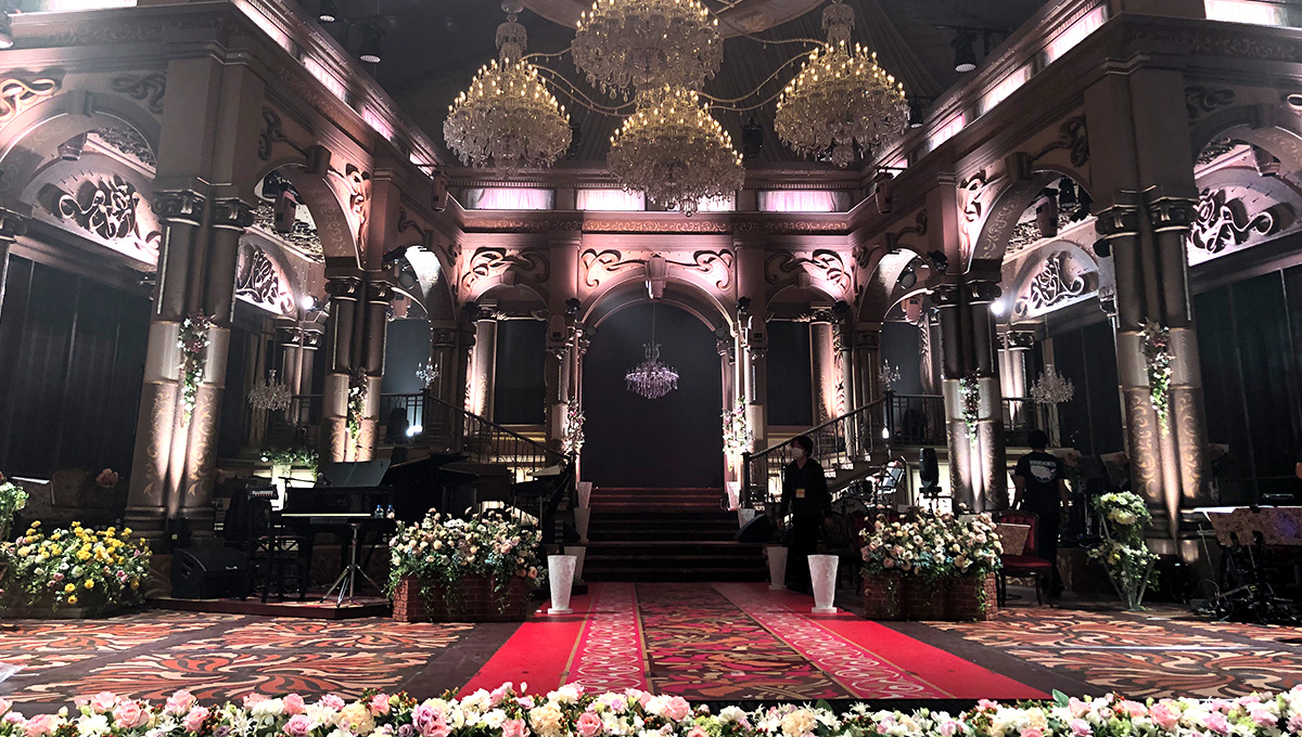 前年は武道館でしたので、天井が高い大きな円形空間の会場でした。一方、飛天はものすごく広い宴会場だったので、まず会場に入ったときの第一印象は「綺麗な巨大シャンデリアと天井の模様がとても美しい空間」でした。また、テレビ局のスタジオと大きく異なり、かなり広々としているので、空間負けしないセットをデザインしようと思いました。