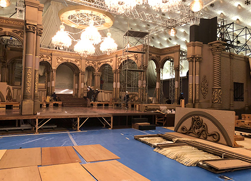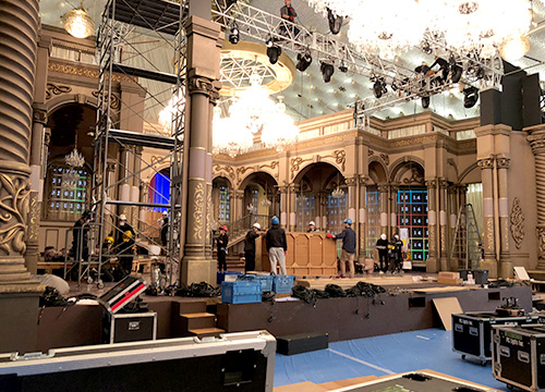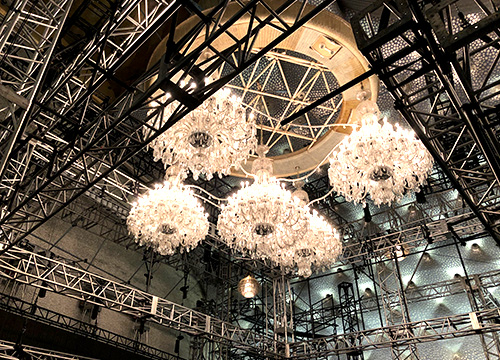 日本最大級のシャンデリアがあるために何もできないという不便さもあります。便利な位置にシャンデリアを持っていきたくても、巨大で重過ぎるので位置は固定。高さも場所も変わらない。シャンデリアを避けながらセットを作りました。