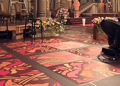 例えば、柱のディテールや質感、色、またステージをカメラが俯瞰で撮った時、バッチリ見える床のデザインも気を抜けない部分。照明のライティングとの調和も考え、色、デザインを決めています。
