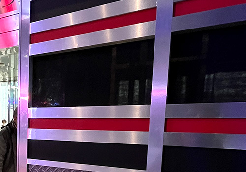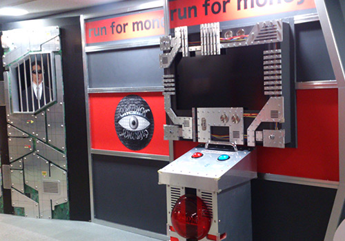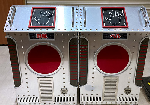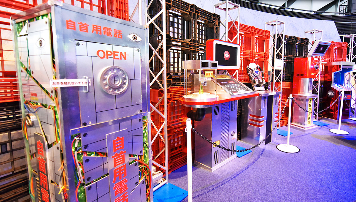 『逃走中』の装置やアイテムは西暦2900年の未来から転送されてきているモノということなので、未来で行われているエンターテインメントショーを想像しながらデザインしてきました。そんな未来世界の企業「クロノス社」の謎に満ちた部分を表現するため、バラエティーでは珍しいのですが、緊張感のある赤と黒とシルバーを多用しています。また、セット内には「クロノス社」のシンボルマークである目玉のロゴを随所に入れています。装置や印刷物など様々なところにレイアウトしていますので是非探してみてください。